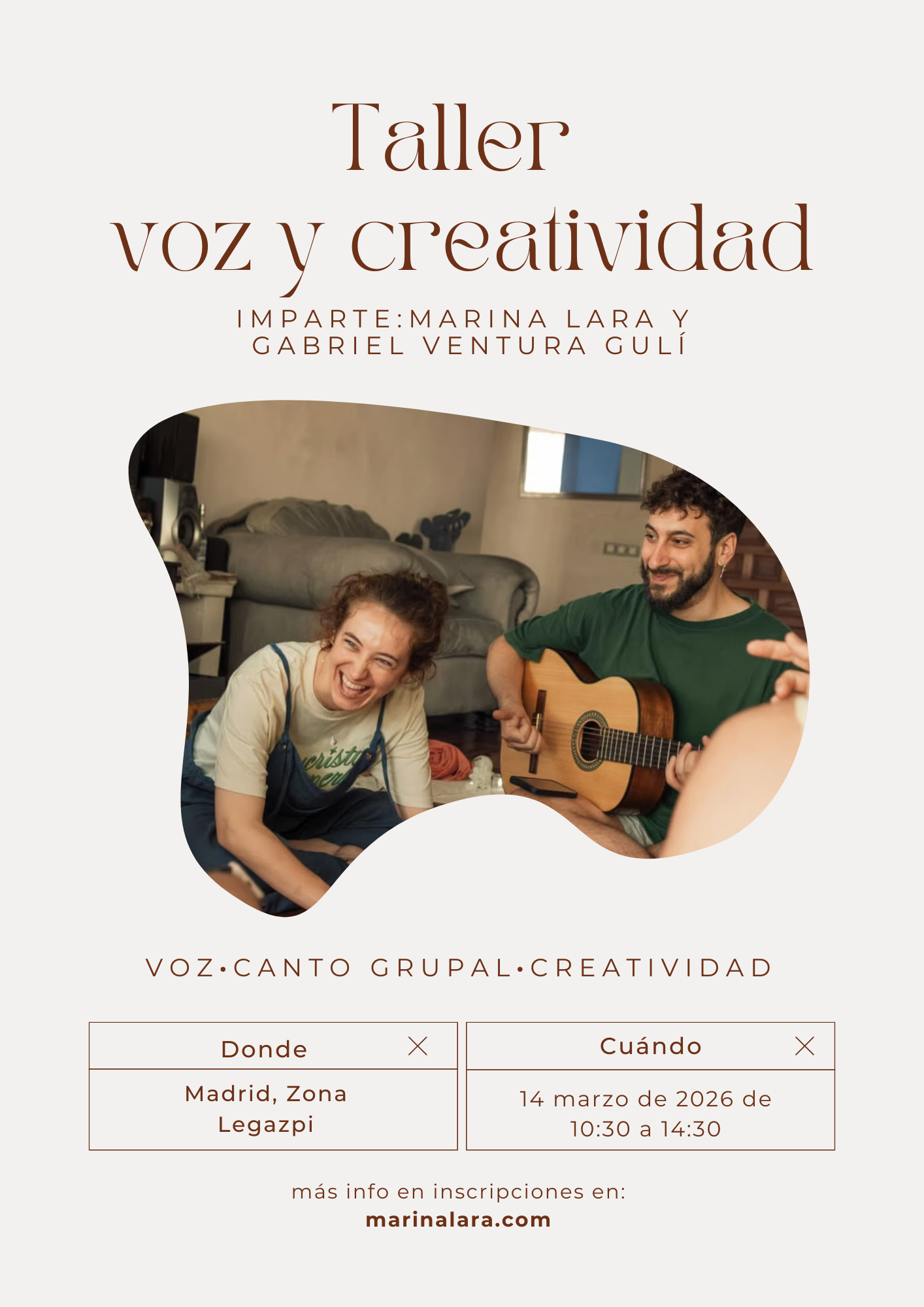 Un espacio para expresarte con confianza, despertar tu creatividad y reencontrarte con el placer de usar tu voz tal y como es.Impartido por Marina Lara y Gabriel Ventura Gulí